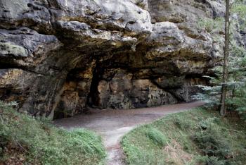 Der Weg ist gar nicht so lang, er kommt einen nur lang vor, weil er sich unendlich in alle Richtungen schlängelt und krümmt. Manchmal lassen die Bäume einen Blick frei auf den Großen Winterberg und die Goldsteinaussicht. Nach etwa 5 Kilometern stehen wir vor einem gewaltigen Wanddurchbruch, den wir durchwandern. Nun ist es nicht mehr weit bis zur Hickelhöhle. Sie ist die zweitgrößte Höhle der Sächsischen Schweiz, 12 bis 14 Meter tief und 45 Meter breit. Wenn das nichts ist! Ein Hinweisschild erklärt uns, dass es sich um eine sehr breite Schichtfugenhöhle handelt. Der Weg geht weiter durch die Hickelschlüchte steil nach unten. Nach etwa einem Kilometer treffen wir wieder auf den Großen Zschand (rote Markierung), diesen Weg wandern wir dann etwa 3 Kilometer zum Zeughaus zurück.